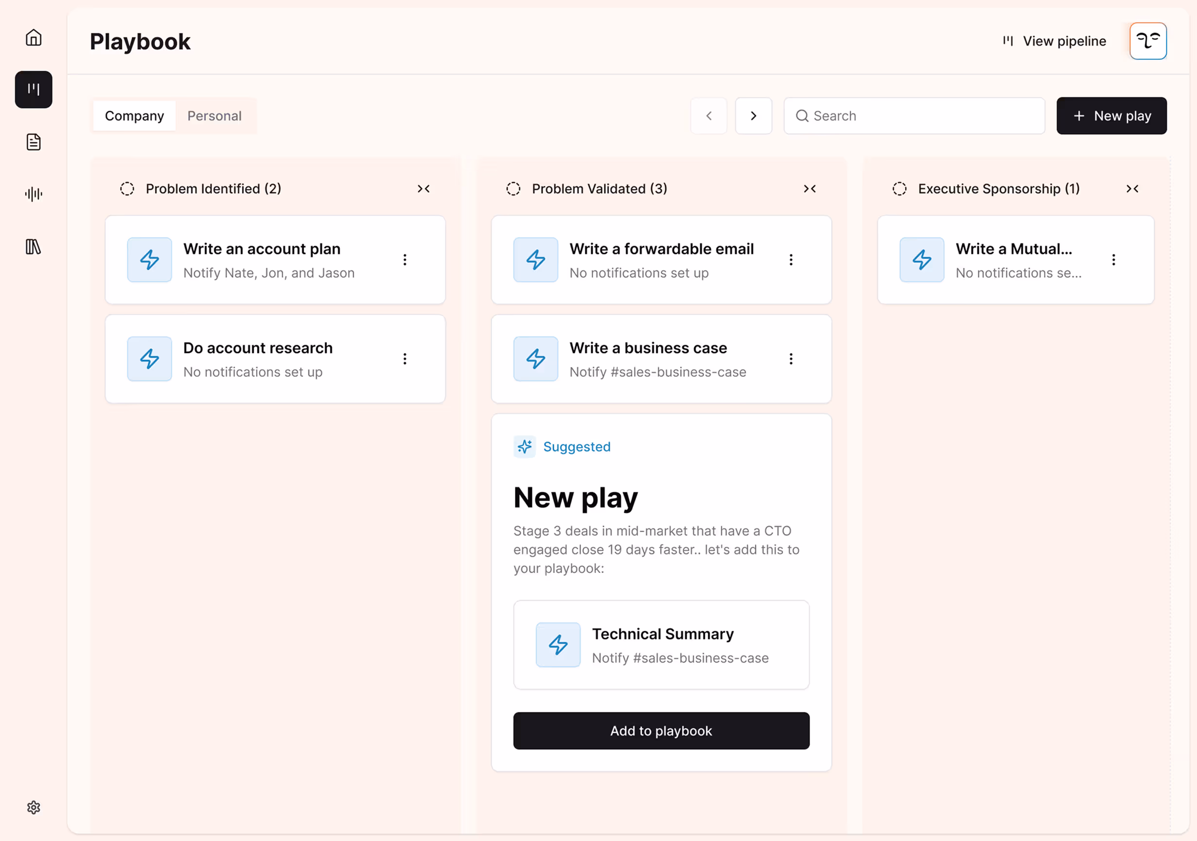 Complex deals stall when they’re built on templates that can’t adapt. Scale an account-based sales process with highly-tailored plays that learn from and build on each other: point-of-view → account plan → executive summary → demo strategy → deal review → onboarding + expansion brief. For every deal.