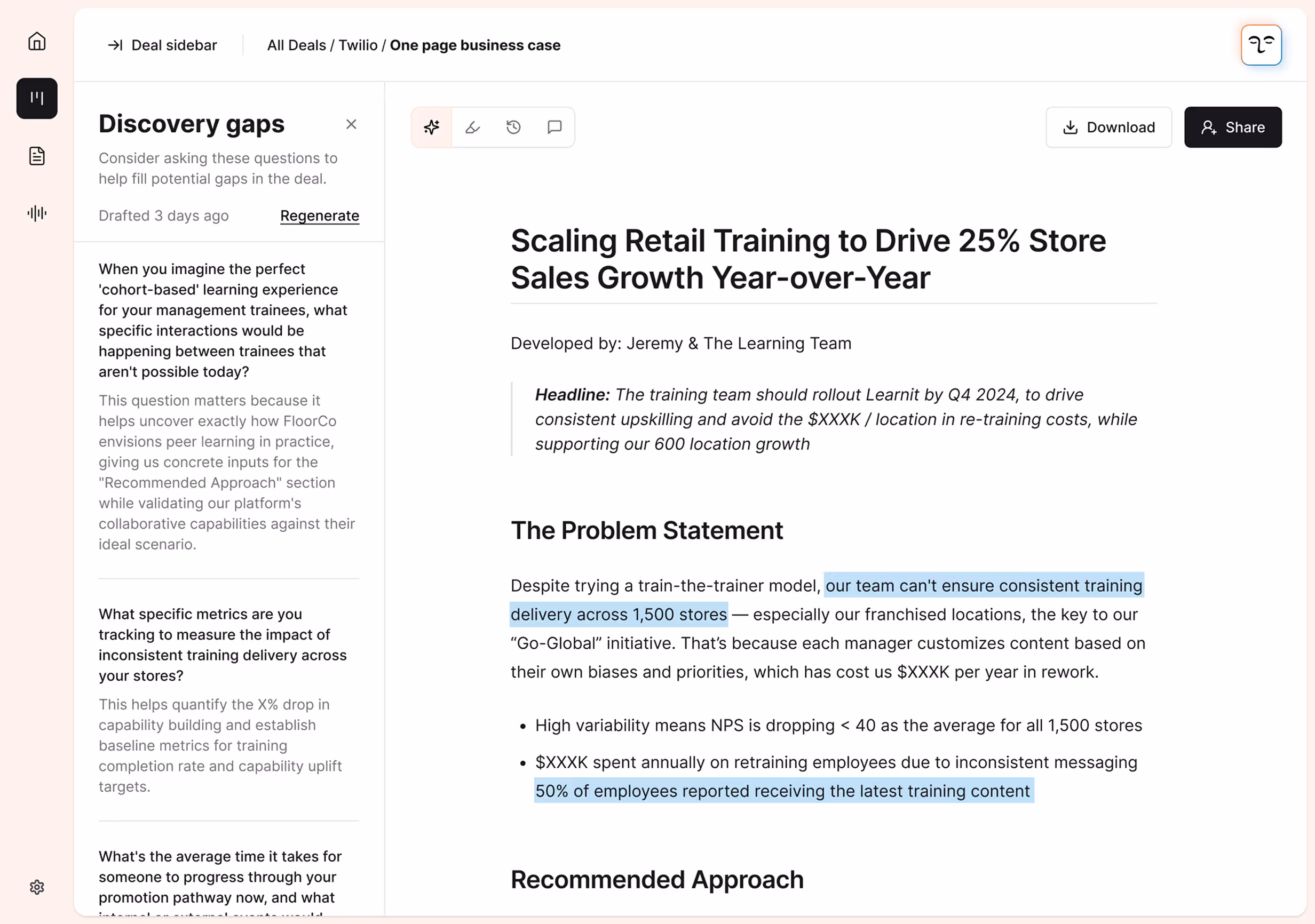 - Surfacing gaps in discovery so sellers can fill them before deals stall