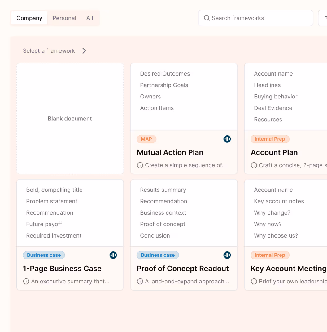 Handoffs for post-sales, deal and demo briefs for pre-sales, and more. With a ready-built library, or bring-your-own frameworks.