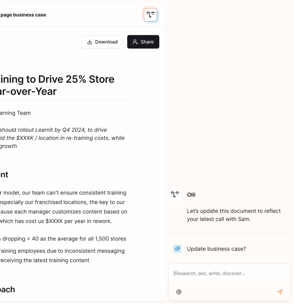 Instead of just summarizing what’s already happened, Olli diagnoses why your deals are stuck, based on a model of your own closed-won data, and then actually does the work to get them unstuck with you. Building out specific plays to equip your champions, and drive deals forward.