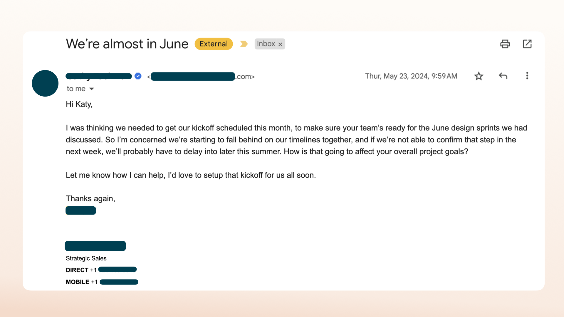 They send a follow-up email reminding their main contacts about their timeline. That they’re behind, and they’re reaching out to help get them back on track.