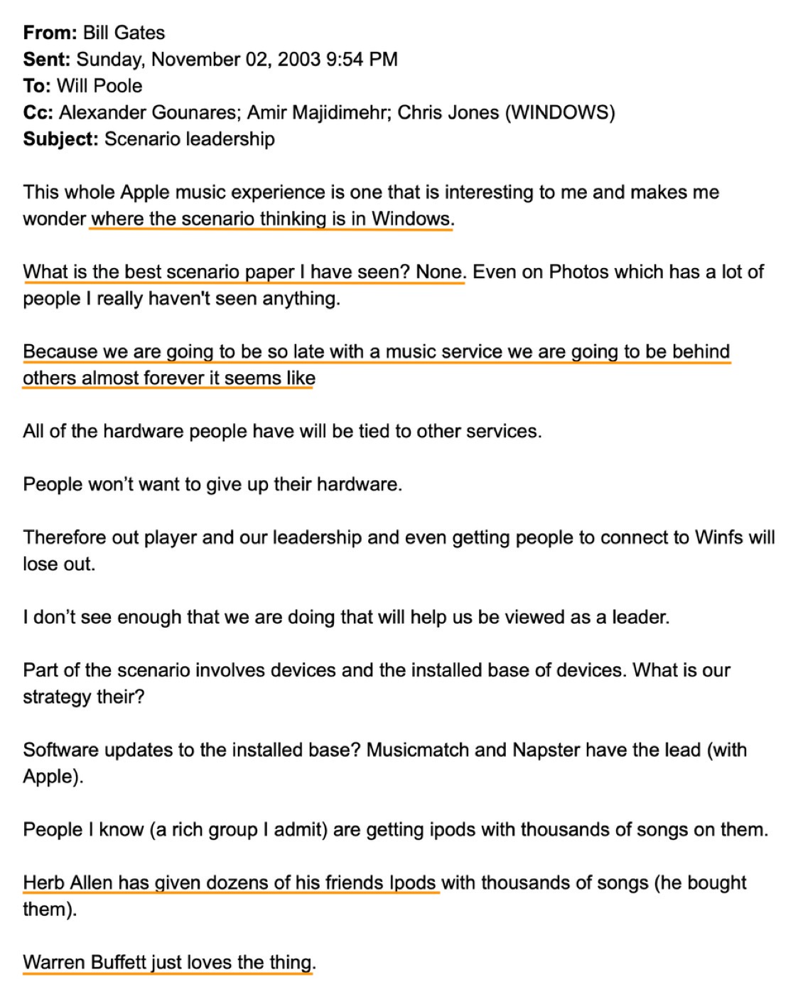 He feels Microsoft is falling far behind in the music business, and emails his execs with two very different ways of thinking: