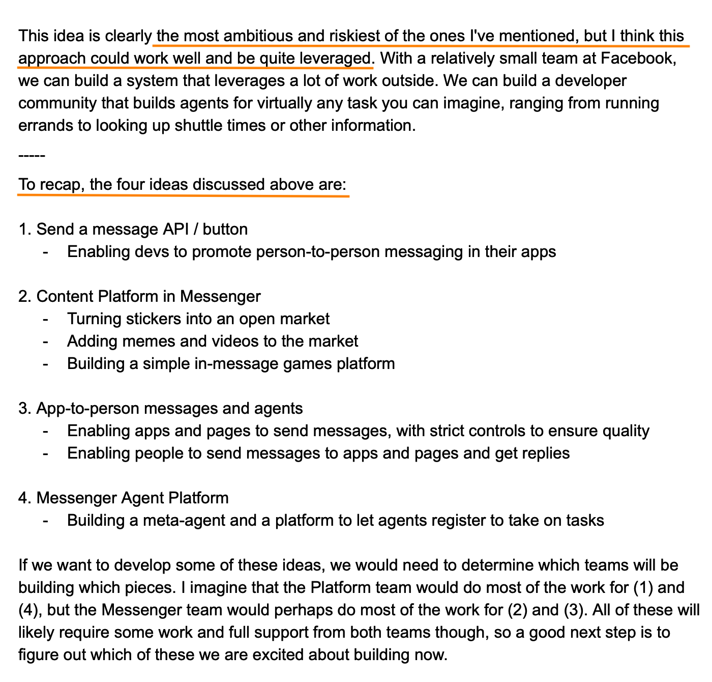 Inside that same 4,200-word email, Zuck outlines 4 different ways to get their Messenger Platform moving in the right direction. Here’s him teeing up the different approaches: