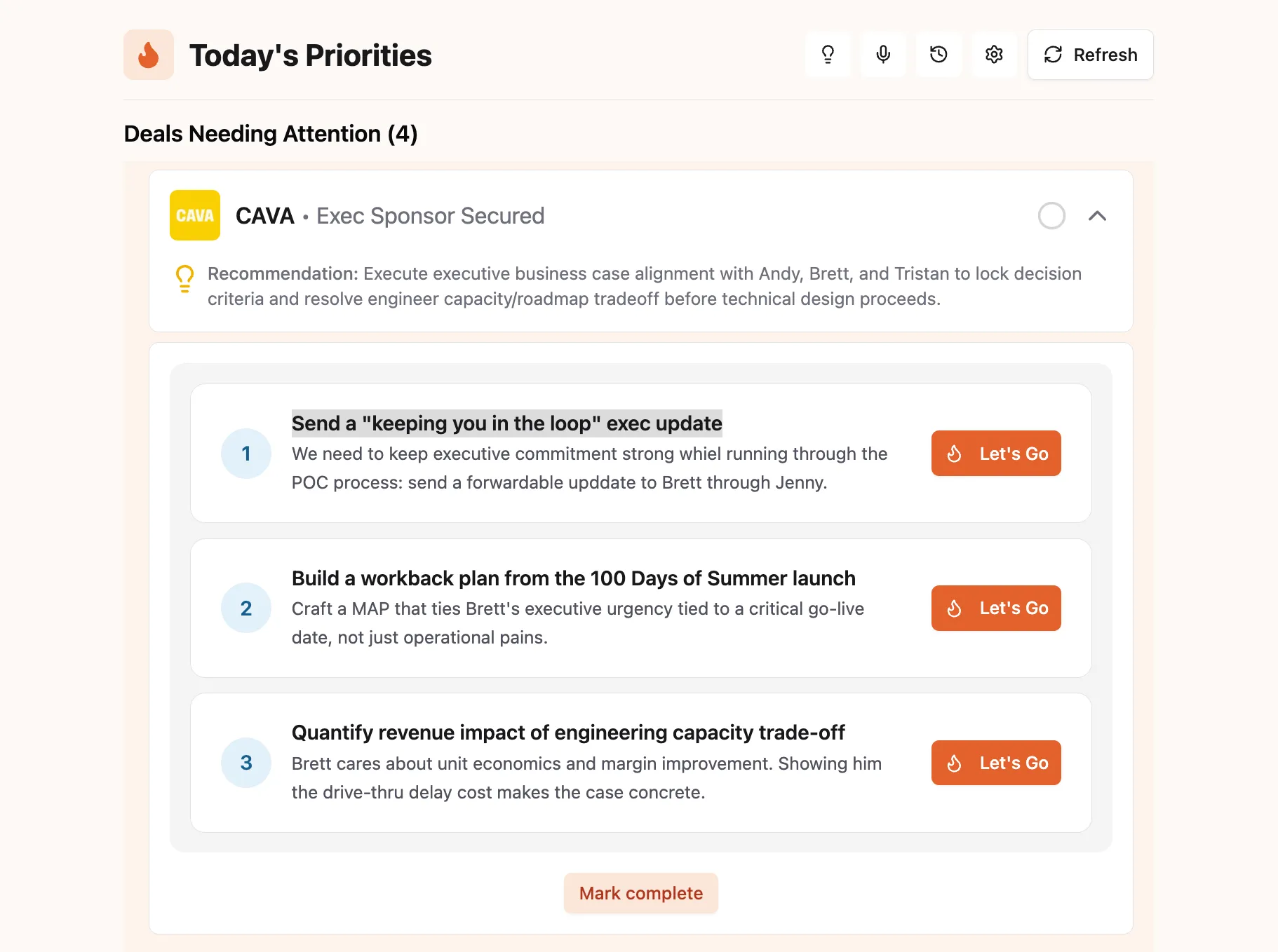 When a deal hits executive stages, Olli flags it in your Today's Priorities and surfaces the specific actions you need to take to keep momentum: