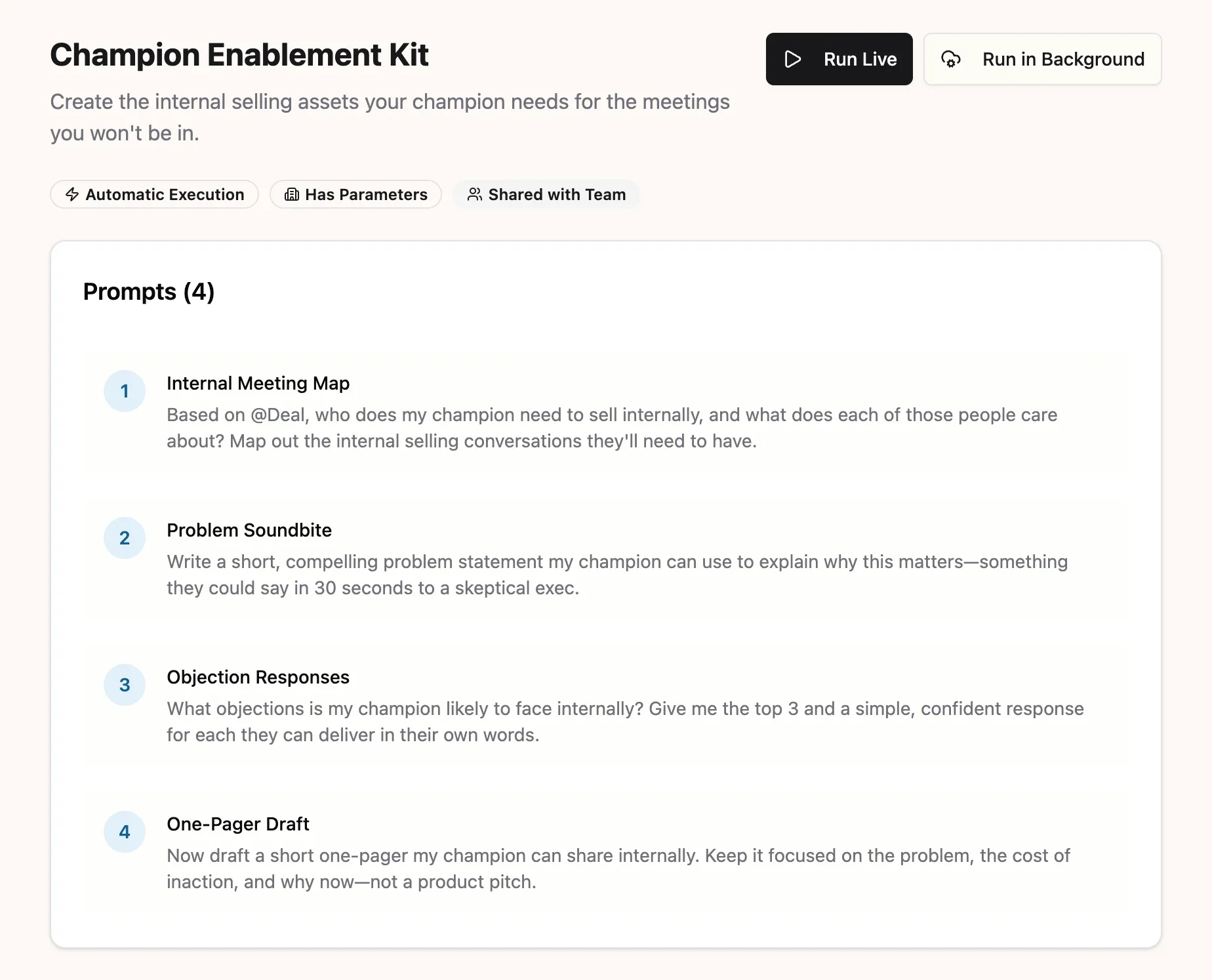 Four prompts, automatically generated based on your deal: