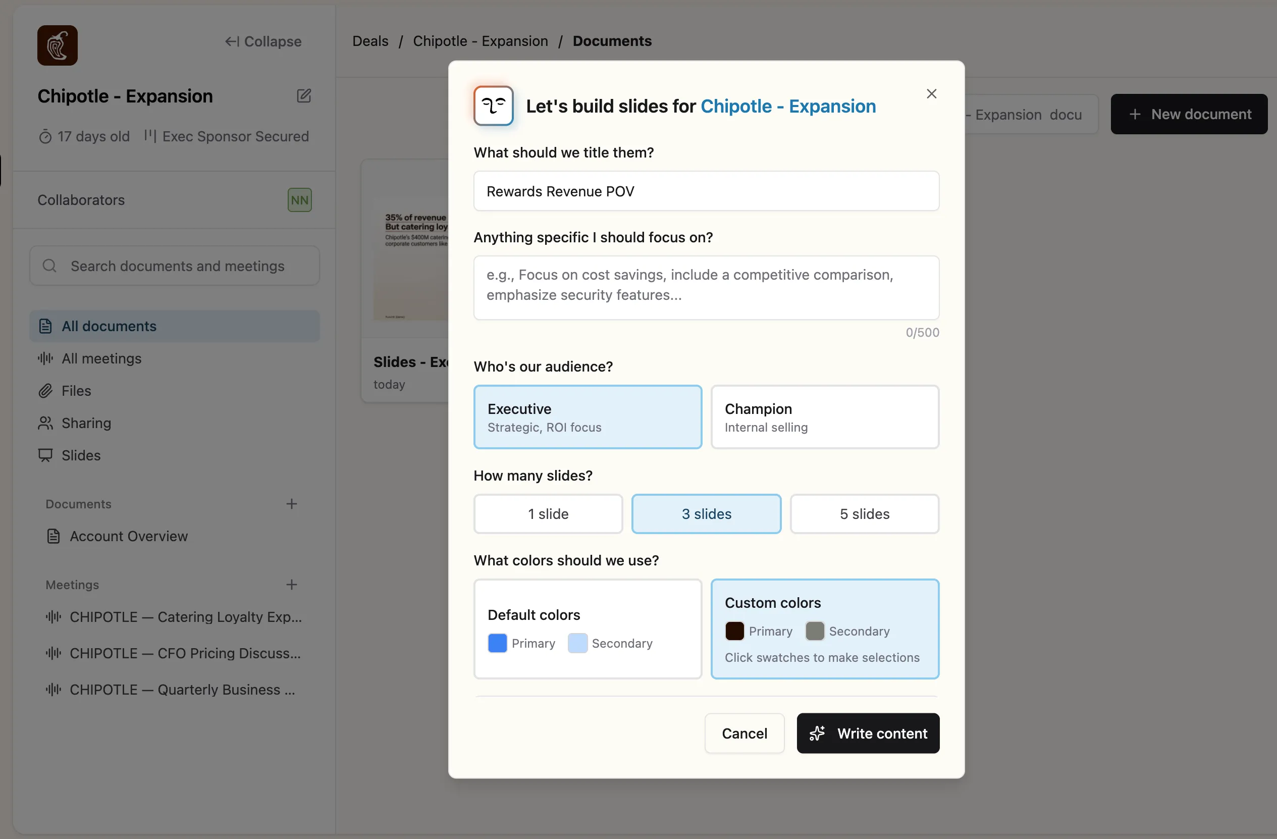 For the Chipotle deal in the screenshot, the rep is building a 3-slide executive deck focused on "Rewards Revenue POV." Olli knows the deal context, the executive's priorities, and what matters most—so it builds slides that get to the point.