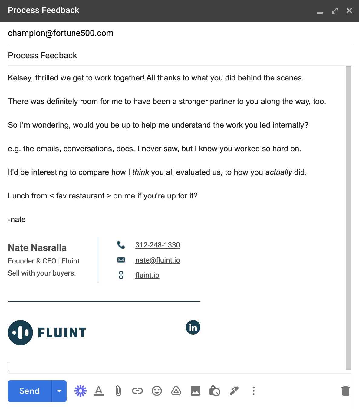 Finally, try using the “Process Feedback” email inside these 12 mid-funnel emails with your past champions, to build out the baseline MAP you’re starting from: