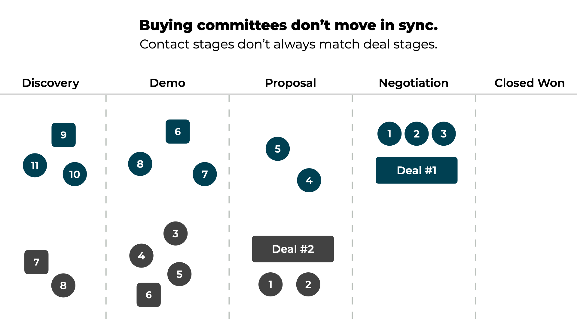 The reason is that buying committee members don’t move in sync. Their “contact stages” don’t line up with their “deal stage.”