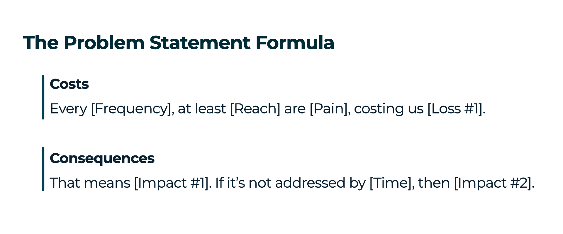 That’s where the process of crafting a written problem statement comes from. You need a sharp hook to follow the trigger phrase in your headline. Here’s a formula to try out: