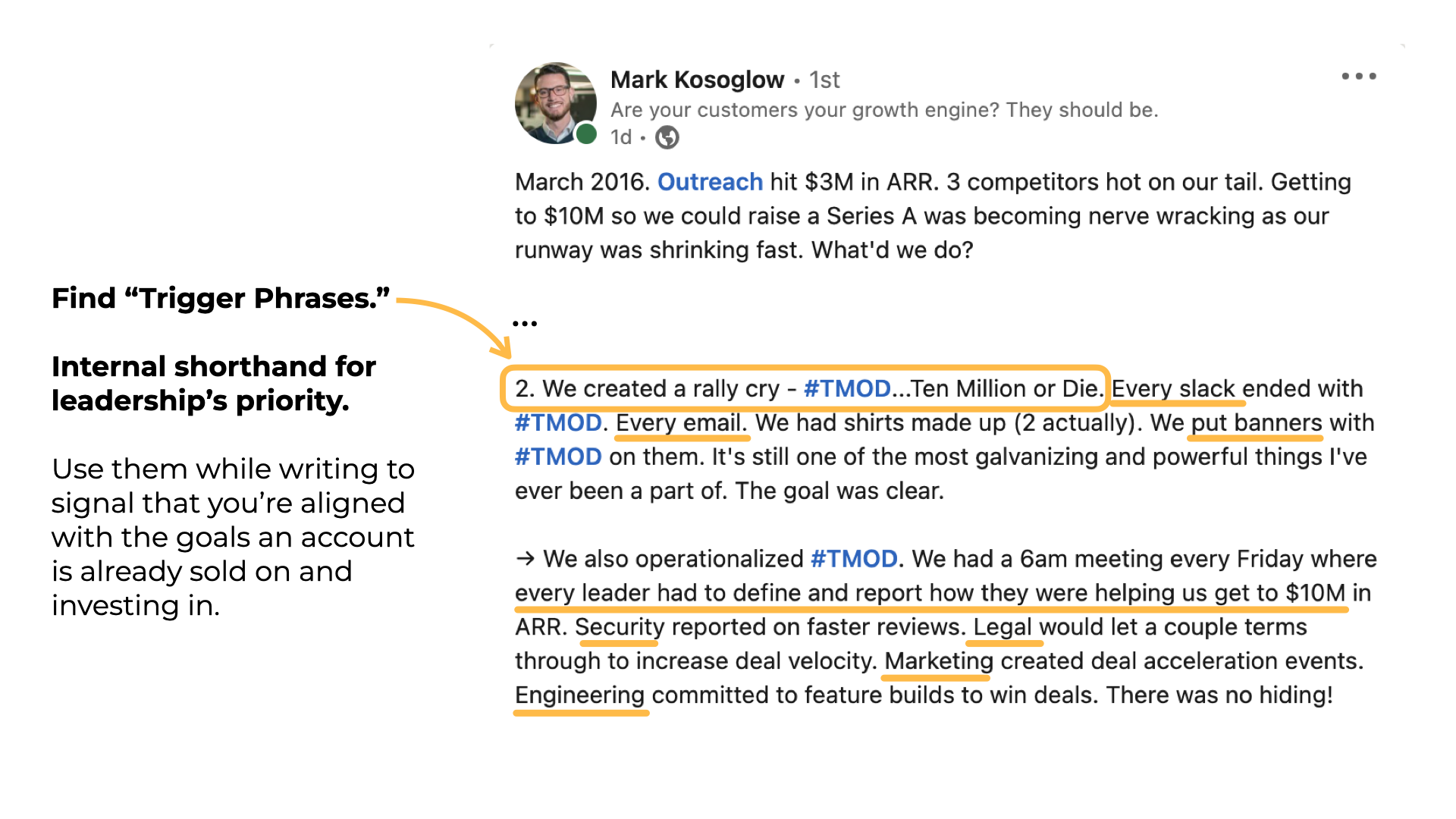 ”Ten Million or Die,” or #TMOD for short, was their internal Trigger Phrase. Shorthand for the goal everyone was sold on. Hitting $10M in ARR by a certain date.