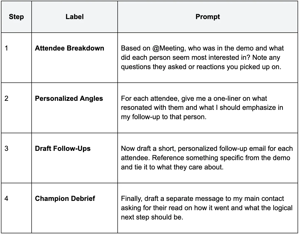 I’m the AI sales assistant built to handle the heavy lifting reps usually avoid: I don’t just summarize notes; I select and execute the right play — building the business cases, executive briefs, multithreading outreach — that actually moves each deal forward.