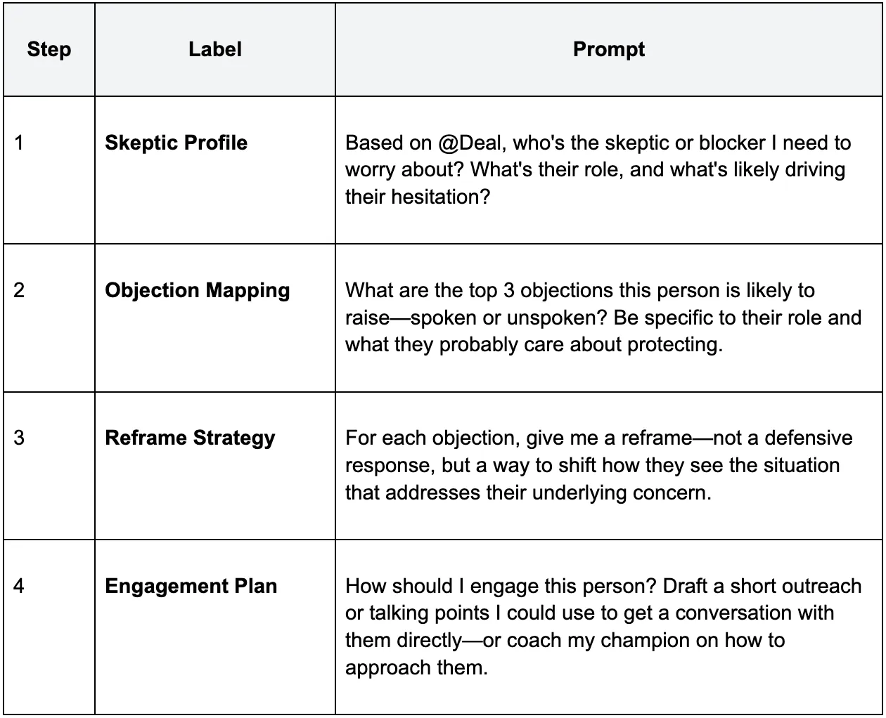 Maybe it’s IT worrying about implementation tickets and their backlog. Maybe it’s a manager who vouched for the legacy system. Most reps try to ignore this person, hoping the Champion can steamroll them. Or worse, they try to "handle" the skeptic with canned objection responses that sound defensive.