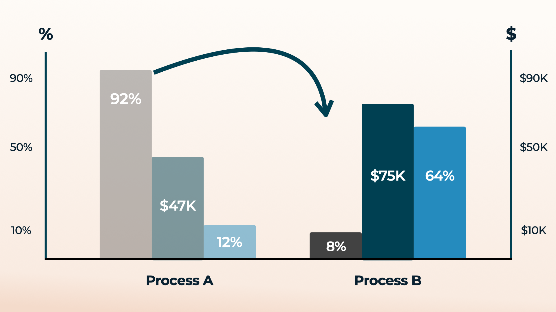 - B: A shift in process. A new approach that produces higher win rates, and bigger ACV. But it’s only being applied to a fraction of deals.