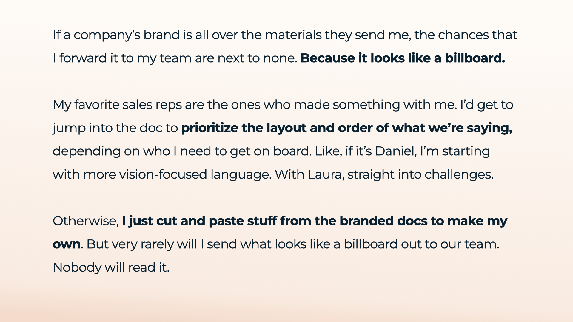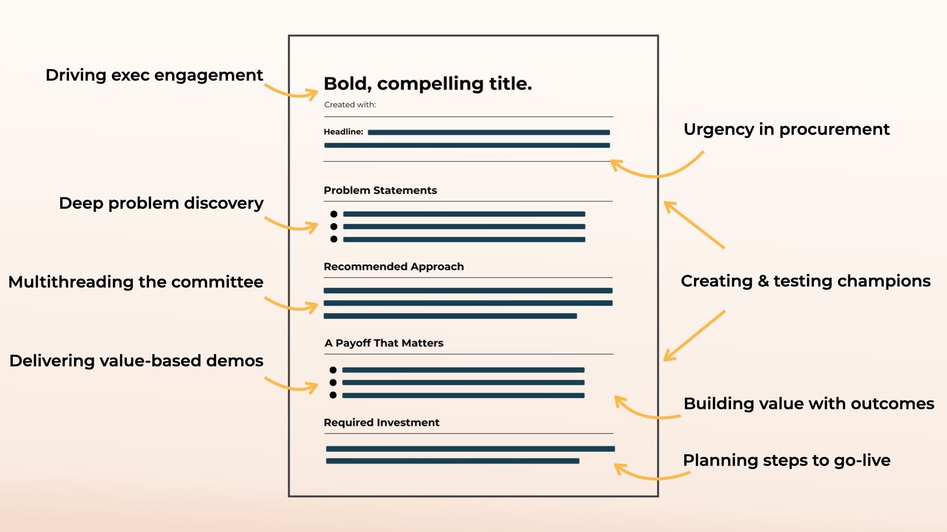 - (Champion Building) Did key contacts with internal influence help write this? Do they feel a sense of ownership? Did they change our draft to make sure it’ll land?