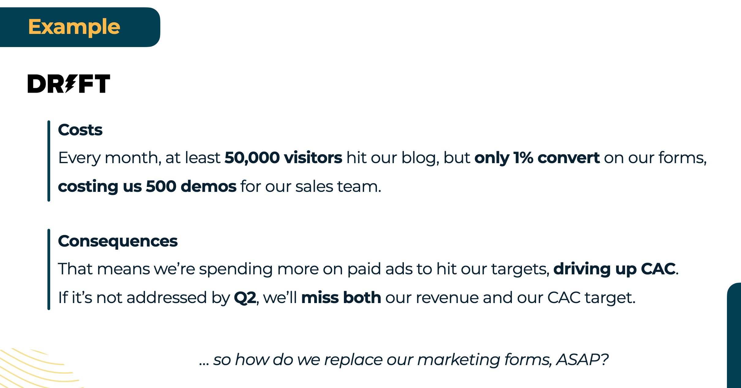Remember from earlier, people do business with the partner who can articulate their problem better than anyone. (Plus, youâll be getting a head start on point one to your business case.)