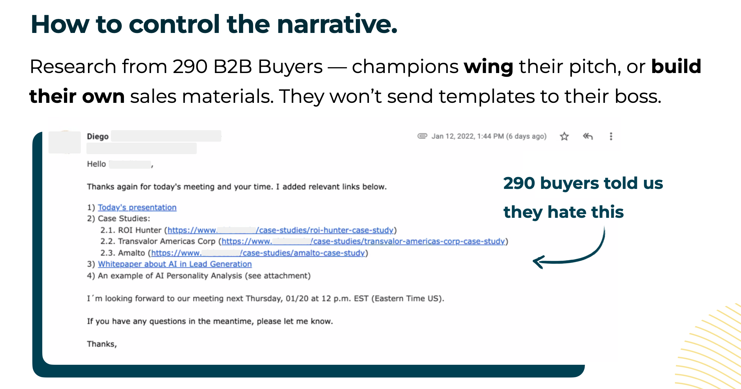 Buyers pick option #1 because they wonât send your sales templates and marketing material to their boss. It doesnât sound like them, or speak to their bossâ exact goals.