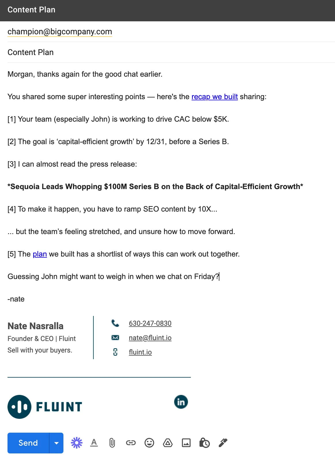 Fluint lets you apply everything in this playbook to the deals you’re working on, right now. Get an executive-ready content in seconds, built with your buyers words and our AI.