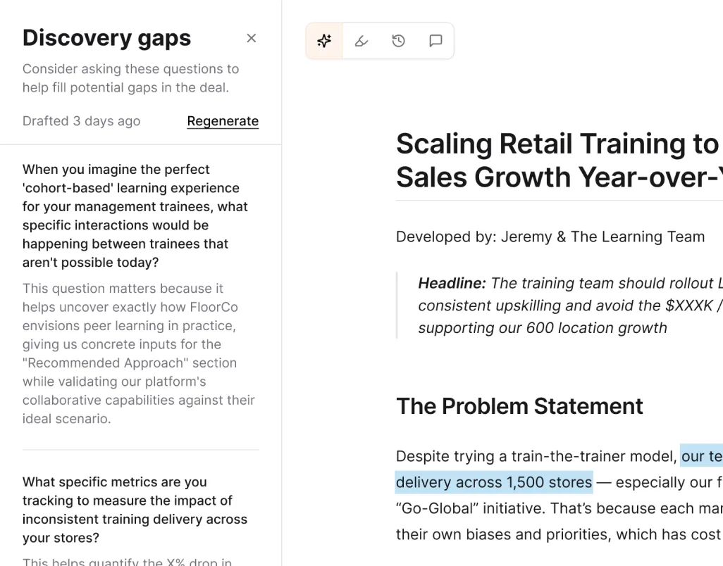 - Surfacing gaps in discovery so sellers can fill them before deals stall