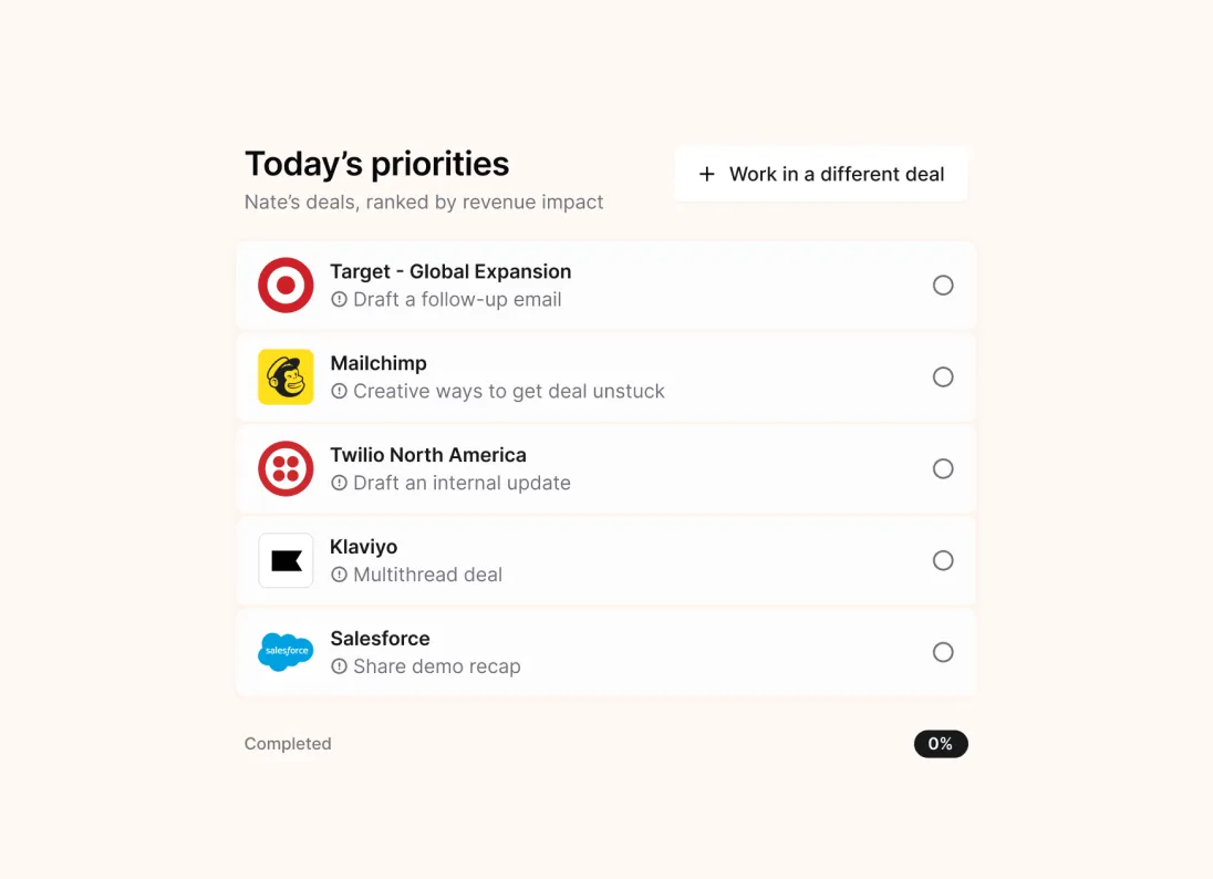 Instead of just summarizing what’s already happened, Olli diagnoses why your deals are stuck, based on a model of your own closed-won data, and then actually does the work to get them unstuck with you. Building out specific plays to equip your champions, and drive deals forward.